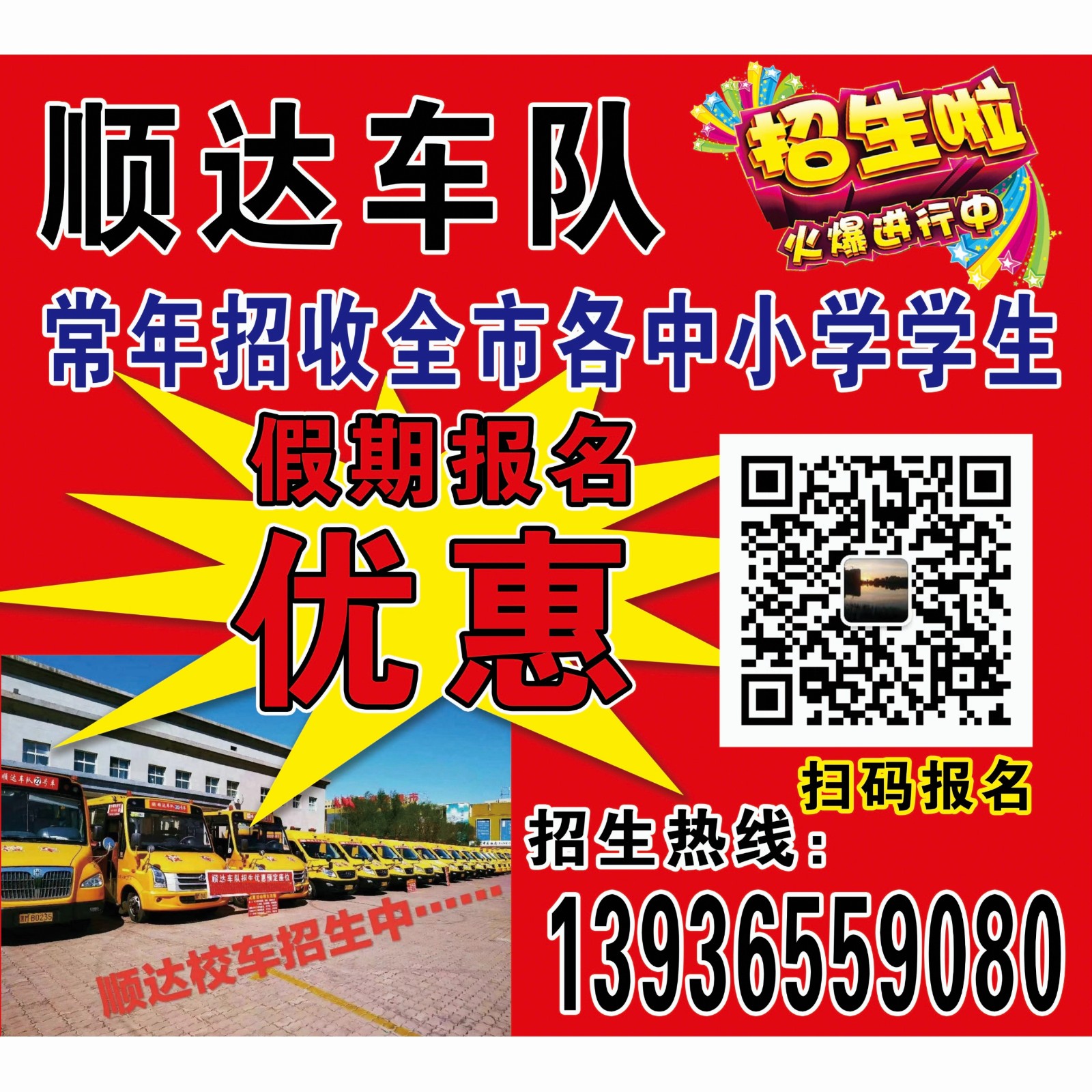 ☀️保障學生安全,尊重家長意見;肩負社會責任,守護祖國未來。 順達校車車隊暑期優(yōu)惠招生活動開始了!招生范圍包括市內(nèi)各個中小學校。報名電話:13936559080
