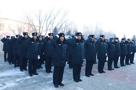 隨著鏗鏘的警歌響起,中國人民警察警旗在北國冰雪中冉冉升起。民警輔警代表整裝列隊,警容嚴(yán)整,面向警旗莊嚴(yán)敬禮并宣誓。