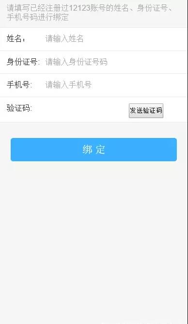 如沒(méi)有綁定直接跳轉(zhuǎn)到綁定頁(yè)面,輸入相關(guān)信息進(jìn)行綁定即可,沒(méi)有12123用戶直接注冊(cè)。