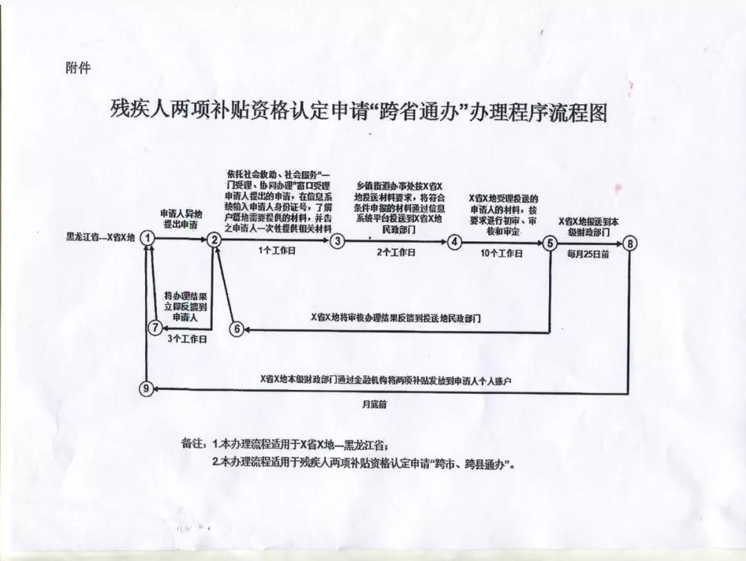 二、規(guī)范補貼資格認(rèn)定申請“跨省通辦”程序各鄉(xiāng)(鎮(zhèn))、街道辦事處要按照異地代收代辦方式,統(tǒng)一使用全國殘疾人兩項補貼信息系統(tǒng)(以下簡稱全國系統(tǒng))受理殘疾人兩項補貼資格認(rèn)定“跨省通辦”申請。受理地要一次性告知申請人所需要提供的材料,及時將相關(guān)證明材料等申請信息錄入全國系統(tǒng),并在申請材料收齊之日起3個工作日內(nèi)推送至業(yè)務(wù)屬地(即申請人戶籍所在地)的補貼受理窗口;業(yè)務(wù)屬地為申請人遠(yuǎn)程辦理,自收到推送材料之日起10個工作日內(nèi)完成補貼資格認(rèn)定,辦理結(jié)果將由全國系統(tǒng)實時反饋受理地;受理地應(yīng)在收到辦理結(jié)果3個工作日內(nèi),將辦理結(jié)果以適當(dāng)方式通知申請人。享受補貼政策的類型及標(biāo)準(zhǔn)由業(yè)務(wù)屬地負(fù)責(zé)解釋。補貼資格審定合格的,自遞交申請當(dāng)月由業(yè)務(wù)屬地計發(fā)補貼。