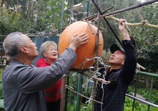 收獲時(shí),左鄰右舍都來幫老人摘瓜。兩個(gè)中年人費(fèi)好大勁兒,才將這個(gè)“瓜王”從鐵制瓜架子上抬下來。