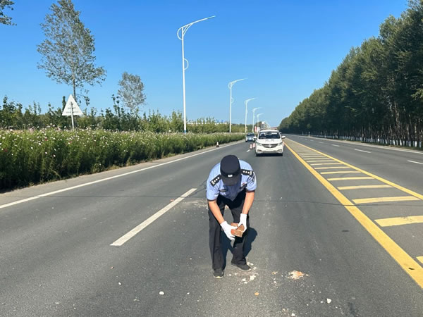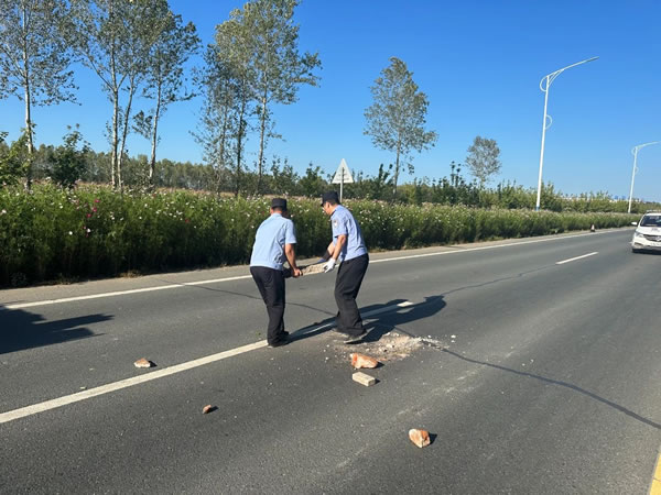 9月2日15時,肇東鎮(zhèn)派出所在轄區(qū)環(huán)南環(huán)路八道街至五岔路口巡邏時發(fā)現(xiàn)路面有過往運輸殘土車輛遺落的混凝土磚塊等殘土,存在嚴重道路交通隱患, 容易引發(fā)道路交通事故,嚴重影響過往車輛正常通行和駕駛人員安全。派出所巡邏民輔警第一時間設立交通反光錐,緩行指示牌,在提醒過往車輛注意行車安全減速慢行的同時,及時清理遺落的殘土,確保道路行車安全,受到過往群眾一致好評。