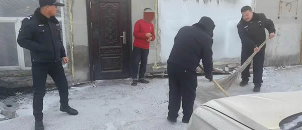 1月23日,天空下起了大雪,正值春雷行動(dòng)期間,民警下街巡邏,當(dāng)巡邏至宋站鎮(zhèn)毛先生家門口時(shí),看見毛先生正拿著掃帚準(zhǔn)備清掃積雪,由于毛先生患有小兒麻痹,行動(dòng)不便,巡邏民警立即下車,拿起掃帚和鐵鍬為毛先生掃雪,經(jīng)過大家的共同努力,不到半個(gè)小時(shí)便將院內(nèi)的積雪清掃得干干凈凈?粗麧嵉脑鹤用壬钌畹馗兄x了宋站派出所的民警。