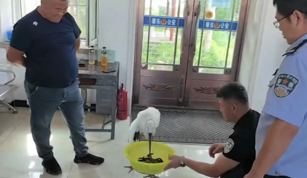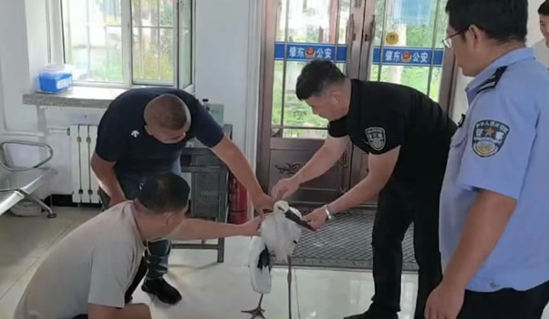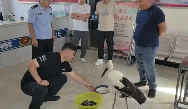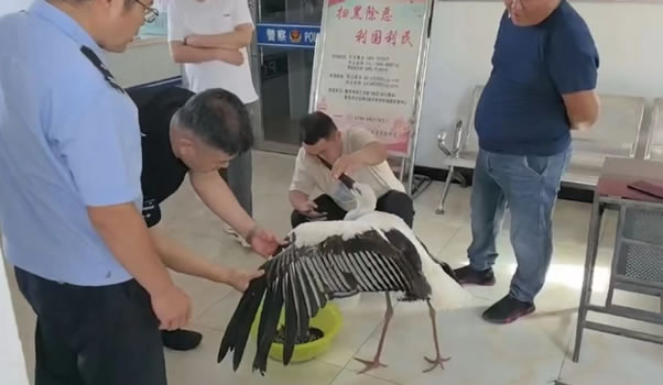 8月28日,躍進(jìn)鄉(xiāng)福龍村書(shū)記宋健來(lái)到肇東市公安局躍進(jìn)派出所,稱在躍進(jìn)鄉(xiāng)福龍村新發(fā)屯草甸子上發(fā)現(xiàn)一只大鳥(niǎo)晃晃蕩蕩落在草甸子上,不斷哀鳴。大鳥(niǎo)體長(zhǎng)120厘米左右,身上大部分呈白色,翅膀下方呈黑色,嘴部呈黑色,嘴的基部較厚,往尖端逐漸變細(xì),并且略微向上翹,前頸的下部有呈披針形的長(zhǎng)羽,腿部較長(zhǎng)。但他一下子想不起來(lái)鳥(niǎo)的名字,只是知道它應(yīng)該是保護(hù)動(dòng)物,因此請(qǐng)求派出所進(jìn)行救助。宋健介紹不知為什么,發(fā)現(xiàn)時(shí)這只大鳥(niǎo)不飛、不動(dòng),行動(dòng)遲緩,也不曾進(jìn)食,走上前也不怕,站在原地,他趕緊將它抱到派出所。民警看到大鳥(niǎo)后宛如“仙鶴”下凡,優(yōu)美的體態(tài),潔白的羽毛,朱紅色的眼眶,寬而長(zhǎng)的翅膀,一看就是不尋常的鳥(niǎo),民警擔(dān)心它有傷或是生病了,立即聯(lián)系肇東市林業(yè)部門(mén),尋求專業(yè)的指導(dǎo);經(jīng)專家仔細(xì)辨認(rèn),這只鳥(niǎo)類(lèi)并不是“仙鶴”,而是被譽(yù)為“鳥(niǎo)中大熊貓”的東方白鸛,是國(guó)家一級(jí)保護(hù)動(dòng)物。經(jīng)初步檢查,其外表沒(méi)有明顯傷痕,右側(cè)翅膀受點(diǎn)輕傷耷拉下來(lái),但整體狀態(tài)較為虛弱,民警在派出所設(shè)置臨時(shí)保護(hù)區(qū)域,確保動(dòng)物的安全,避免其受到二次傷害,民警拿來(lái)小魚(yú)和水進(jìn)行投喂,白鸛簡(jiǎn)單吃了幾只小魚(yú)。隨后民警對(duì)村書(shū)記的救助行為表示感謝。