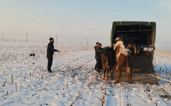 民警了解情況后為了避免瘋牛在村屯里傷害群眾,便立即組織人員開車拿著棒子等工具將瘋牛趕到了屯后的大地里。工作人員幾次試圖靠近瘋牛,但瘋牛看見有人靠近就會向人沖過來,工作人員在幾次奔跑驅(qū)趕中摔倒在了雪地里。工作人員顧不上個人安危,但考慮到采取強(qiáng)攻制服瘋牛的策略勢必會造成人員損傷,經(jīng)過研究準(zhǔn)備采取智取方式制服瘋牛。經(jīng)過近一小時的忙碌后,這時瘋牛的情緒逐漸穩(wěn)定下來了。工作人員見時機(jī)成熟,慢慢的靠近老牛,并快速的拽住韁繩,將牛趕上了車。最后大伙一起將牛送回了李老漢的家中。