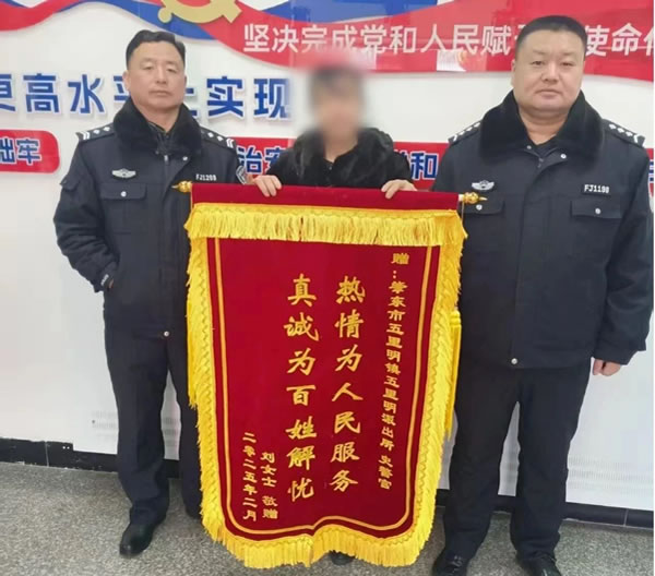 近日,哈市居民劉女士將一個印有“熱情為人民服務,真誠為百姓解憂”的錦旗送到五里明派出所民輔警手中,以表達人民警察幫助她脫困時伸出的援助之手。