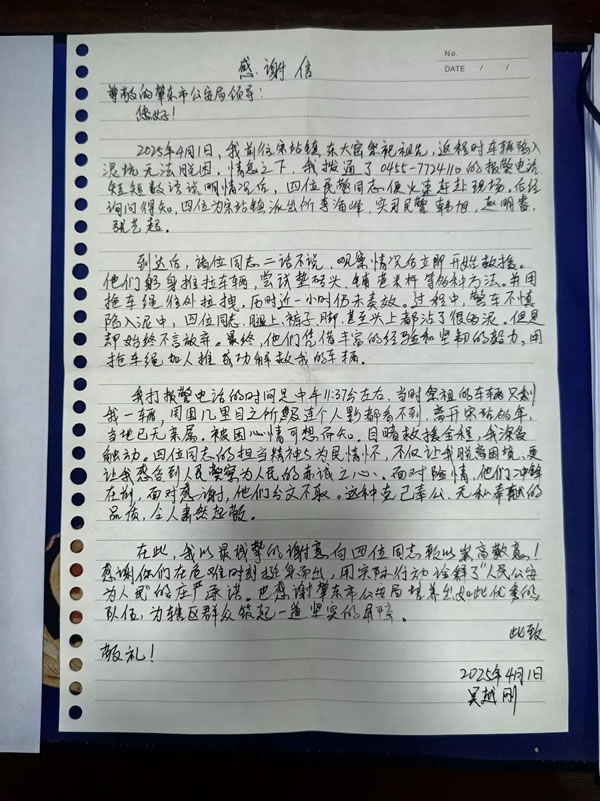 近日,肇東市公安局宋站派出所民警用實(shí)際行動(dòng)書寫了為民服務(wù)的暖心篇章。民警張臨帶領(lǐng)新警張藝超、韓旭、趙明睿,成功幫助一名外地司機(jī)吳先生將陷在泥地里的轎車拖拽出來(lái),讓司機(jī)在困境中感受到了人民警察的關(guān)懷與擔(dān)當(dāng),4月7日,群眾吳先生親自到肇東市公安局為“春苗”民警和宋站派出所民輔警送來(lái)感謝信。