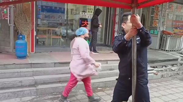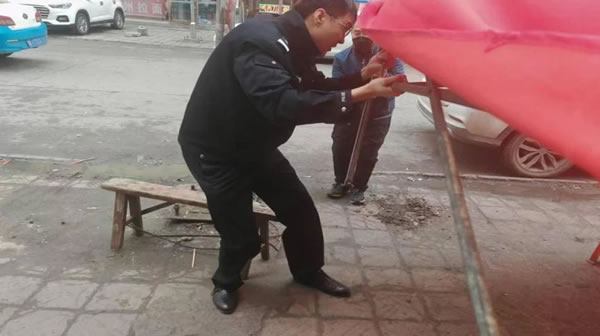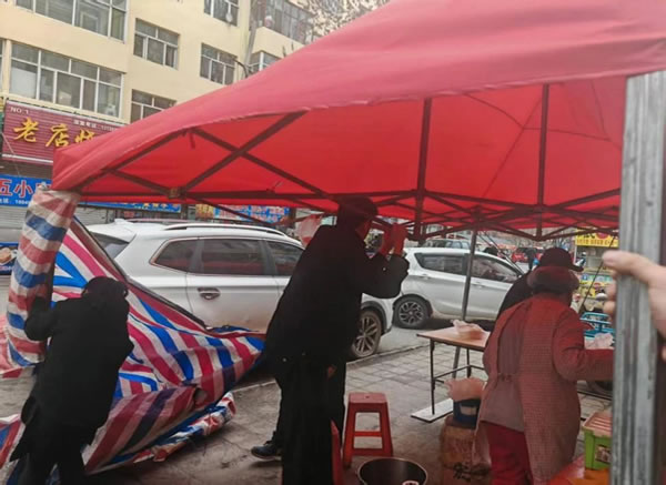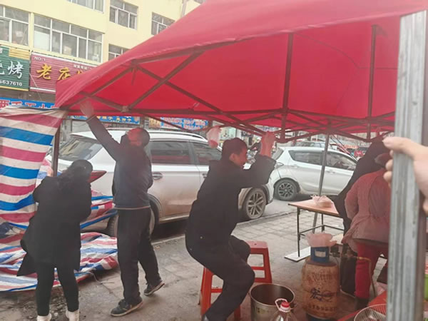 上午,副所長吳復(fù)生帶領(lǐng)輔警崔曉亮巡邏至花園街一商鋪門口時,發(fā)現(xiàn)其門口用于遮擋其制作油條臺子的簡易帳篷在大風(fēng)中劇烈搖晃。此時老板正在帳篷內(nèi)忙碌制作油條,周圍行人不斷,帳篷一旦被大風(fēng)掀翻,后果不堪設(shè)想。見此危急情況,吳復(fù)生和崔曉亮立即快步上前。他們先安撫緊張的老板,讓其不要慌亂,隨后兩人齊心協(xié)力,在狂風(fēng)中艱難地將帳篷收起。盡管大風(fēng)呼呼作響,吹得他們站立不穩(wěn),但二人始終沒有放棄。