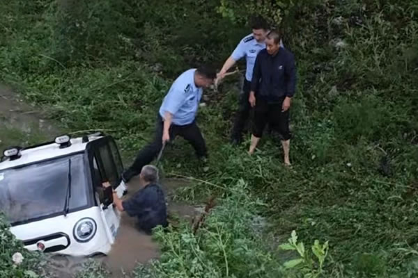 現(xiàn)場,一輛電車側(cè)翻在坑內(nèi)水流中,車輛熄火、人員被困,透過車窗能看到有人揮手呼救。民警耐心安撫被困人員的情緒。救援隊伍兵分兩路,一組民警在過膝的積水中小心翼翼前行,協(xié)助車內(nèi)脫困,另一組民警在路上設(shè)置安全警示標(biāo)識,防止二次事故發(fā)生。由于被困人員所處位置在水域中央,情況復(fù)雜,民警想到拿救援繩進(jìn)行救助,經(jīng)過數(shù)次拋擲,被困人員終于抓住了繩子,民警一點點把被困老人拉上了岸。
