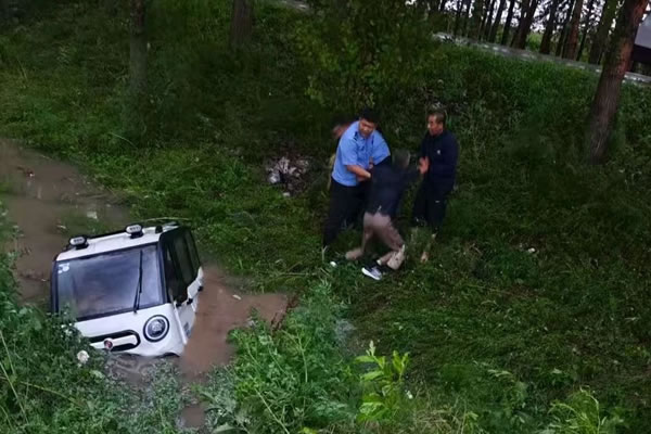 8月2日晚七時許,狂風(fēng)大雨襲擊了肇東市昌五鎮(zhèn),路面和公路兩側(cè)的坑內(nèi)積水瞬間上漲。此時,從肇東方向駕駛電車回躍進(jìn)鄉(xiāng)的六旬老人劉某,因大雨遮擋視線,再加上路面積水過深,操作失誤將車輛開進(jìn)了S311省道昌五鎮(zhèn)境內(nèi)的大坑內(nèi)側(cè)翻,駕駛員被車輛困在坑內(nèi)齊腰積水中,無法脫身。路過的群眾發(fā)現(xiàn)后立刻報警,昌五派出所民輔警接警后趕到現(xiàn)場。