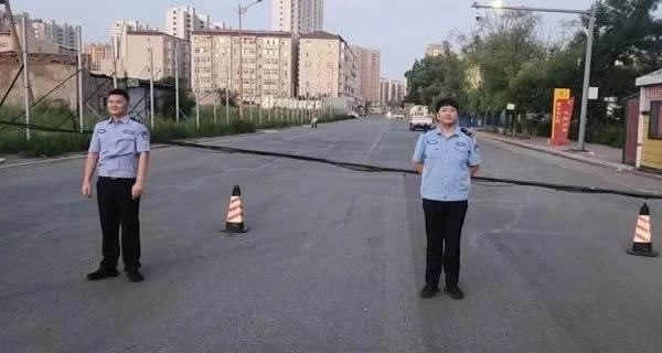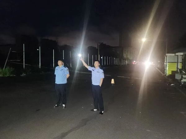 由于該路段照明設(shè)施少,電線桿倒伏位置特殊,現(xiàn)場十分危險,為防止車輛看不見電線而發(fā)生交通事故,在維修人員未到達(dá)現(xiàn)場之前,兩名民警分工明確,一人在來車方向200米處設(shè)置警示標(biāo)志,用喊話器喊話,引導(dǎo)小型車輛從附近小巷道路繞行,大型車輛則在安全區(qū)域等候;另一人負(fù)責(zé)維護現(xiàn)場秩序,防止群眾靠近危險區(qū)域,并耐心向受阻群眾解釋情況。