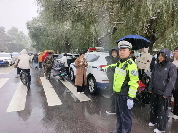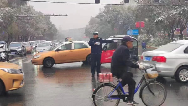 正值上學(xué)上班早高峰時(shí)段,雪勢愈發(fā)急切。路上的車流量正逐漸增大,一排排車輛披著白皚皚的雪花,司機(jī)們開啟行車燈,打開雨刮,小心翼翼地駕駛著車輛。此時(shí),從主干道到居民區(qū)的街巷,身著制服的交警身影早已鋪開,在風(fēng)雪中織就了一張守護(hù)之網(wǎng)。在城區(qū)主要交通樞紐、小區(qū)門口、學(xué)校周邊,忙碌的交警隨處可見。雪花落在帽檐上化成水珠,順著臉頰往下淌,他們卻無暇顧及擦拭。他們的指揮手勢始終沉穩(wěn)而有力,每一次抬臂、轉(zhuǎn)向,都仿佛在風(fēng)雪中劃出了安全的坐標(biāo),給過往司機(jī)“吃下安全的定心丸”。