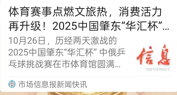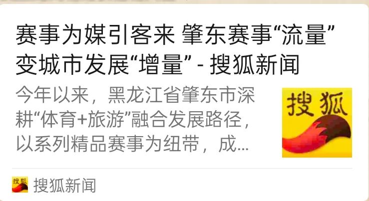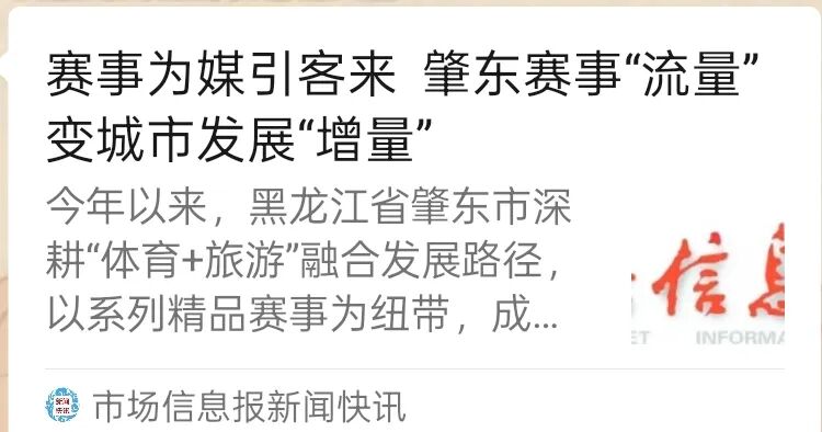 近日,肇東市以系列精品賽事為核心的文體旅融合發(fā)展模式引發(fā)多家媒體集中關注,今日頭條、騰訊新聞、搜狐新聞、百度、市場信息報信息快訊等多家媒體相繼聚焦其賽事經濟成效進行專題報道,讓肇東“以賽促游、以游興城”的發(fā)展故事成為矚目焦點,賽事經濟成為城市的新名片。