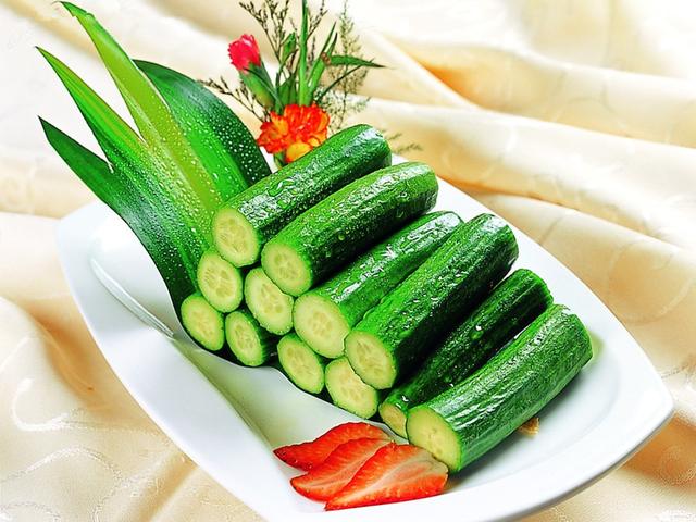 黃瓜:味甘,性平,具有明顯的清熱解毒、生津止渴功效。黃瓜所含的黃瓜酸,能促進人體新陳代謝,排出毒素;能美白肌膚,使其保持彈性,抑制黑色素的形成。
