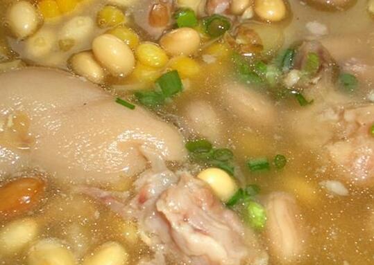 做法:豬腳加入姜片飛水去異味,切成小塊;加入去核切塊的雪梨、大豆和1塊姜,加足水煮到沸騰,開蓋繼續(xù)旺火沸煮15分鐘,轉(zhuǎn)慢火煲1小時(shí),喝之前根據(jù)個(gè)人口味加鹽調(diào)味。