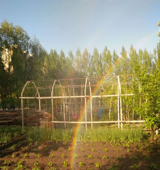 滕立坤是菜園主人,退休后以侍弄樓前5分小菜園為樂趣。由于連日高溫干旱,5月30日6時(shí)許,他在自家水井上按泵通電,將水管連接起噴頭綁在竹竿子上,在菜園子的上空高高豎起,開始噴水澆園抗旱,出乎預(yù)料的是在陽(yáng)光的照射下,水霧中驚奇般的出現(xiàn)了一道亮麗的風(fēng)景線。我趕緊用手機(jī)記錄下了那精彩的瞬間,吸引了數(shù)十名晨練的人們駐足觀看。