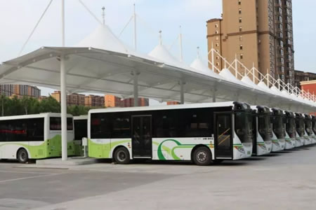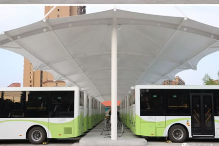 充電站整體建筑,2018年“一期工程”充電棚采用陽光板鋼結(jié)構(gòu),而今年的“二期工程”充電棚建設(shè)采用更加先進(jìn)的張拉膜結(jié)構(gòu),大部分由鋼材、索和膜構(gòu)成,造型美觀,兼具透光、節(jié)能、環(huán)保,優(yōu)良的阻燃性,防污自潔性為一體,最重要的是安全、可靠、壽命長(zhǎng)。